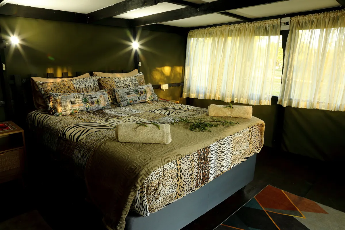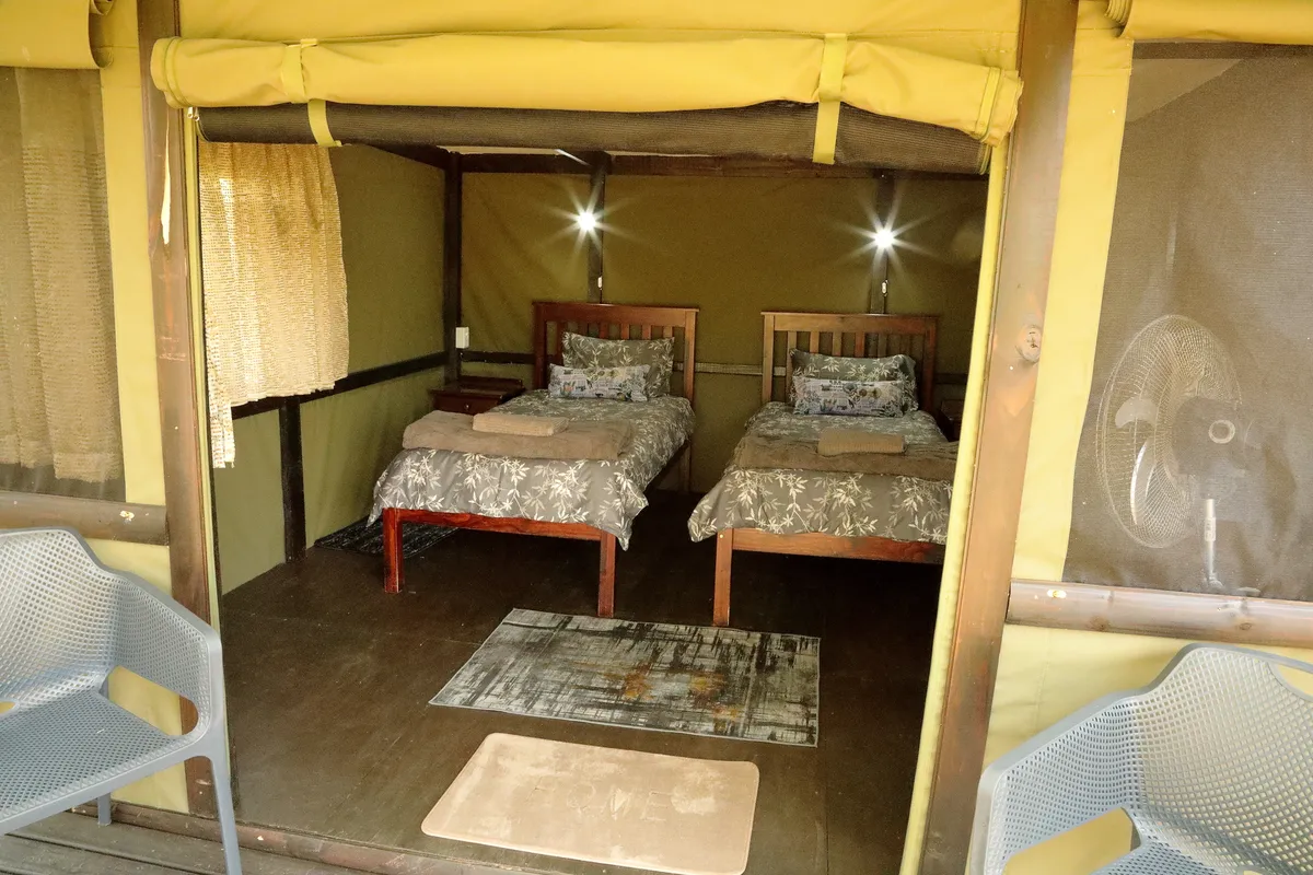 For couples seeking luxury glamping, this elegant tent combines canvas charm with modern comforts. Includes a queen-size bed, en-suite bathroom with bath and shower, kitchenette (bar fridge, microwave, kettle, single electric plate), outdoor braai, and a private Tickel Tub hot tub overlooking the bush.