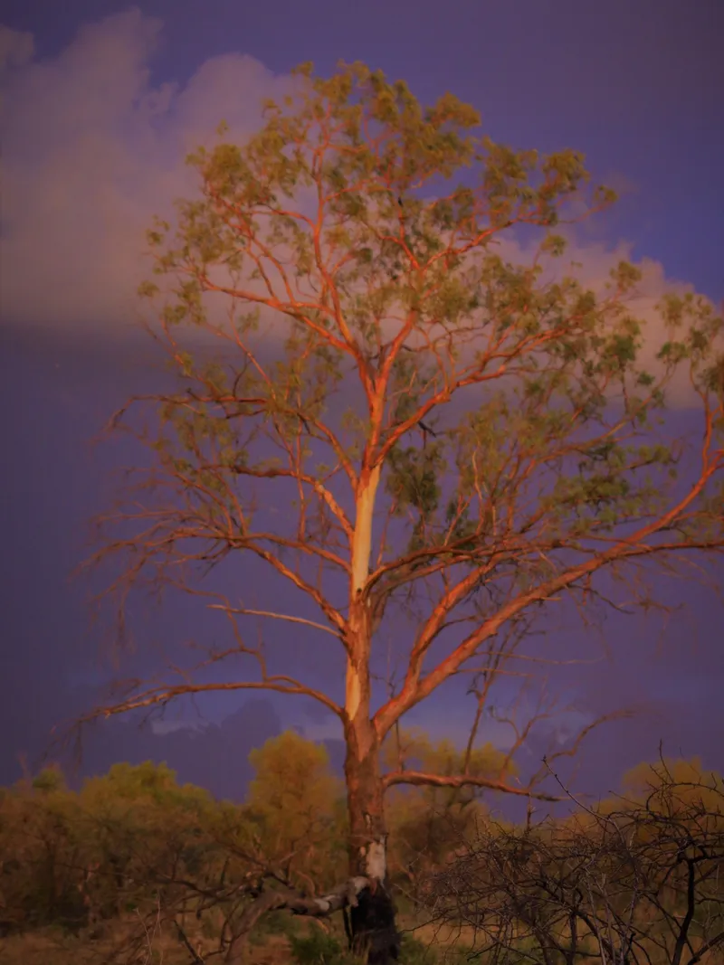 Een aand by die Fever Tree Tented Cabin stap ‘n kameelperd stadig deur die skemer, sy silhoeët teen die vurige lug. Hy kyk af, asof hy sê: “My, my, julle mense maak darem mooi sonsondergange.” ‘n Gas, glas gin in die hand, het saggies gesê: