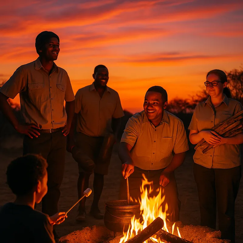 Die Melkweg lê bo jou soos ‘n lanternpad, en die vlamme trek gesigte op elkeen wat sit en staar. Die hitte, die kraak van hout, en die stories — dis die hartklop van die kamp.