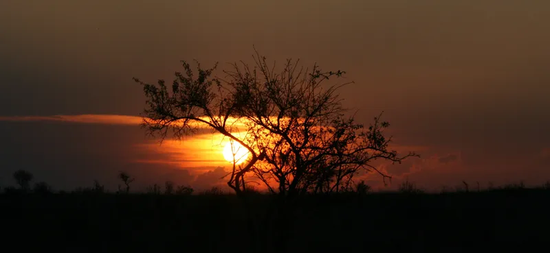 Rooihartebees Kamp lê in die boonste hoek van Thorn Tree Bush Camp, een van daardie privaat kampe met sy eie ablusie en ’n vuurpyl-waterverhitter wat vroeër die aand sy werk gedoen het en nou sagkens tik-tik soos dit afkoel. Teen die heining, oop, die uitsig wyd—die bos strek aan, asof die grens net ’n voorstel is.